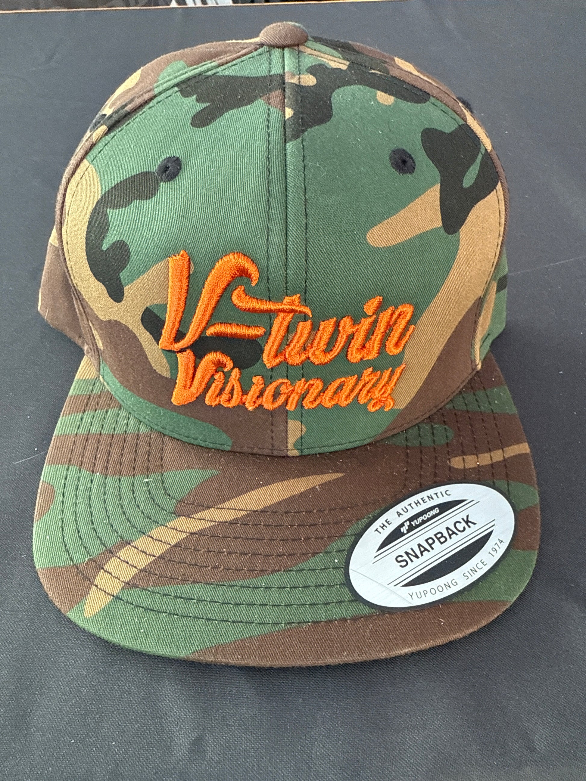 Script V- Twin Visionary in green on camo SnapBack hat.