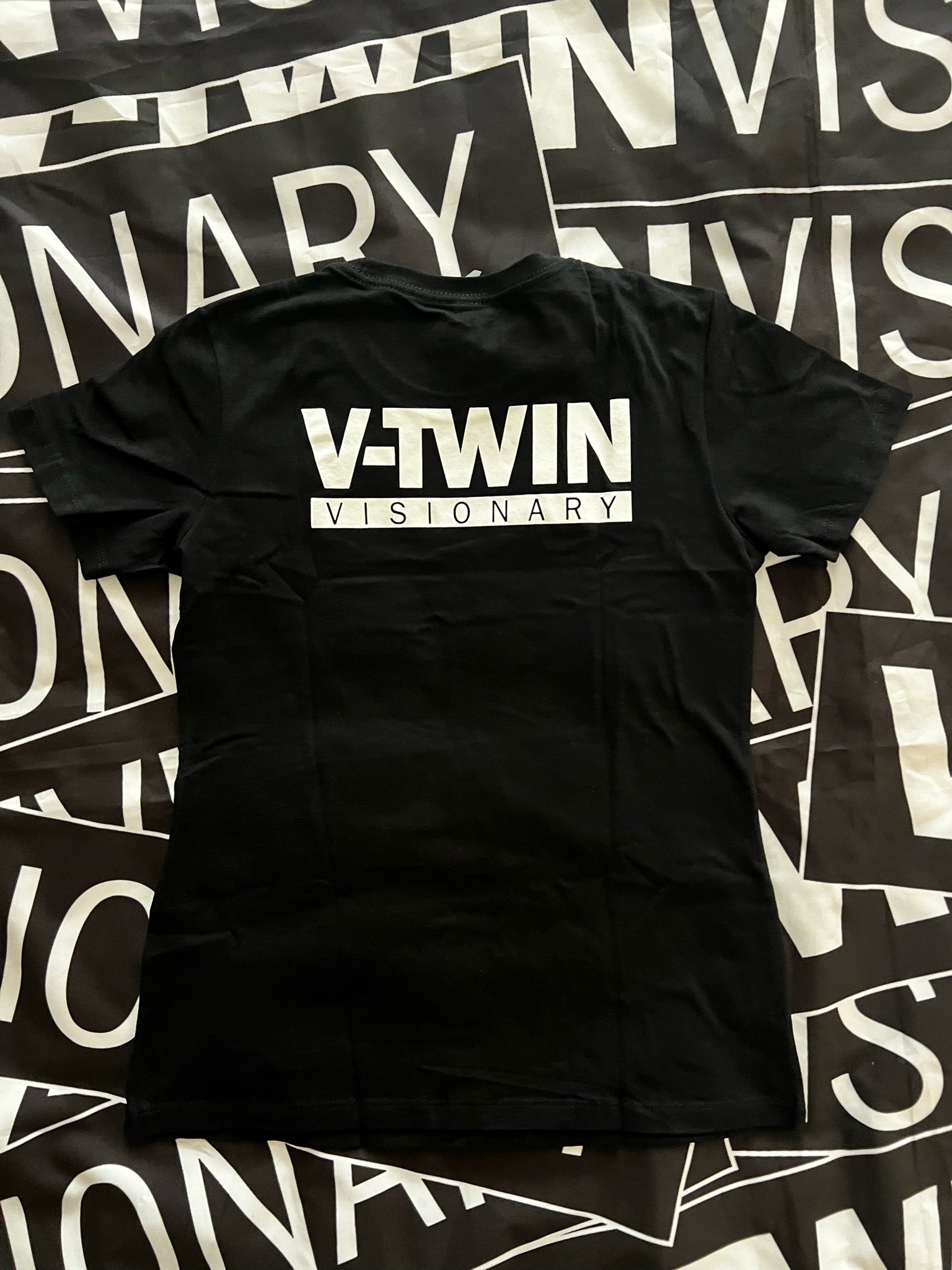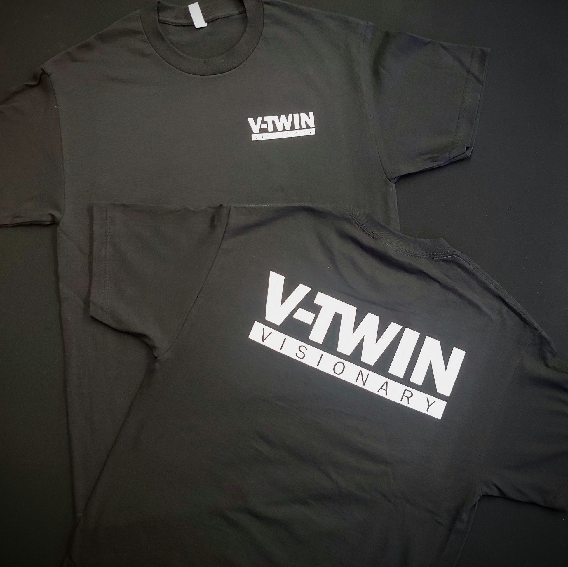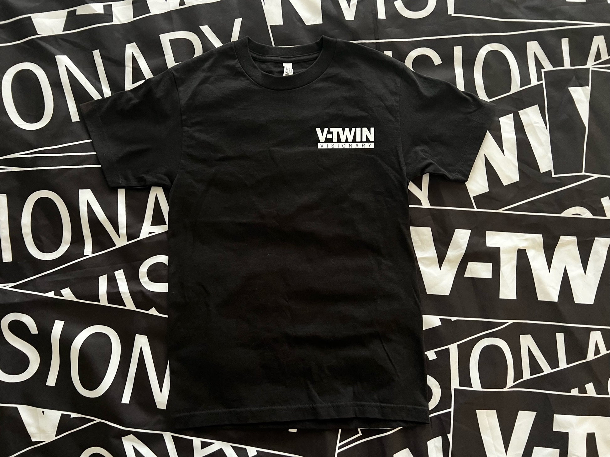 The ever-popular “stacked Logo” shirt has white print on a black shirt.